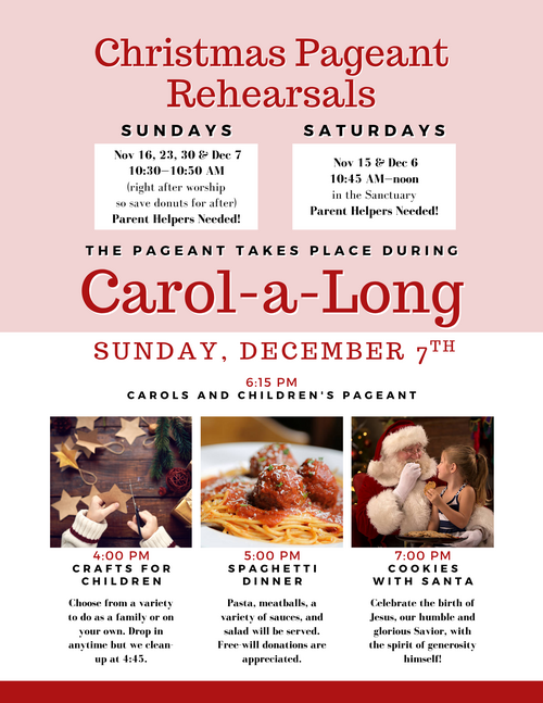- Carol-A-Long: with crafts and carols for all, the children's pageant, and cookies with Santa.